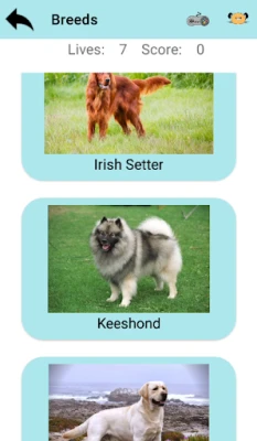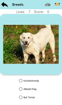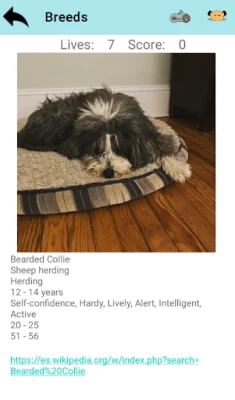 Es un juego en el que tienes que adivinar la raza del perro o del gato. Cuantos más puntos consigas, más arriba estarás en la tabla de records. Para ayudarte tienes en la barra de acción de la parte superior unos pequeños iconos que te permiten visualizar muchas razas y volver al juego, si pulsas la flecha volverás al menú principal.