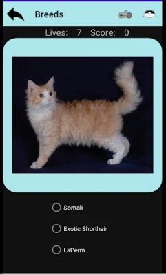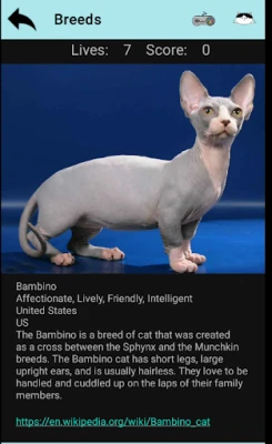 Es un juego en el que tienes que adivinar la raza del perro o del gato. Cuantos más puntos consigas, más arriba estarás en la tabla de records. Para ayudarte tienes en la barra de acción de la parte superior unos pequeños iconos que te permiten visualizar muchas razas y volver al juego, si pulsas la flecha volverás al menú principal.